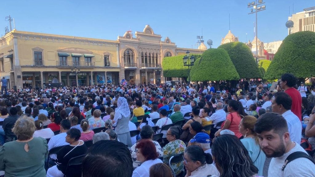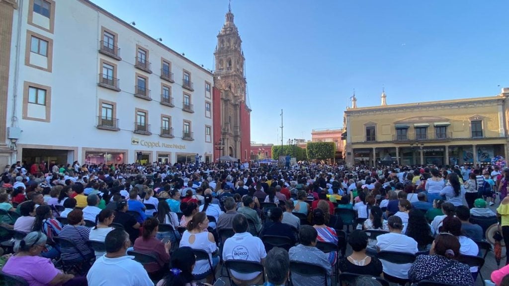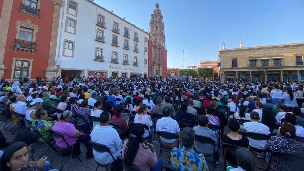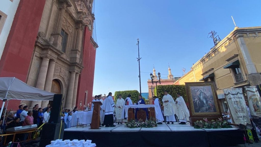 León, Guanajuato — Al menos 2 mil feligreses católicos llenaron la plaza principal de León en una misa donde se pidió por el buen temporal de lluvias ante la Virgen de la Luz, y para que se detenga la sequía en la ciudad.