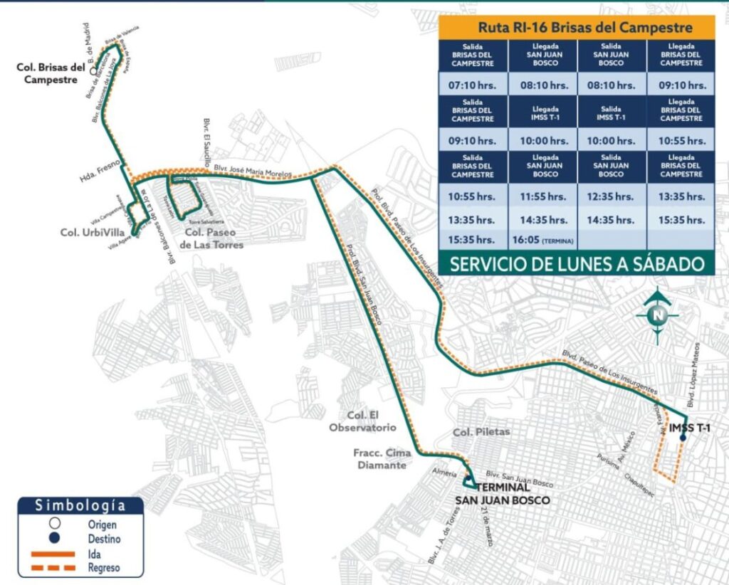 Circulará por las siguientes vialidades, principalmente: Brisas de Barcelona, Balcones de La Joya, José María Morelos, Torre León, Prolongación San Juan Bosco, Paseo de Los Insurgentes y López Mateos.