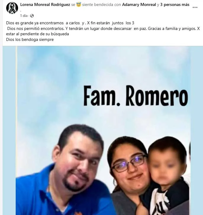 "Dios nos permitió encontrarlos, y tendrán un lugar donde descansar en paz. Gracias a familia y amigos por estar al pendiente de su búsqueda. Dios los bendiga siempre", escribió Lorena Monreal, cuñada de Leonardo.
