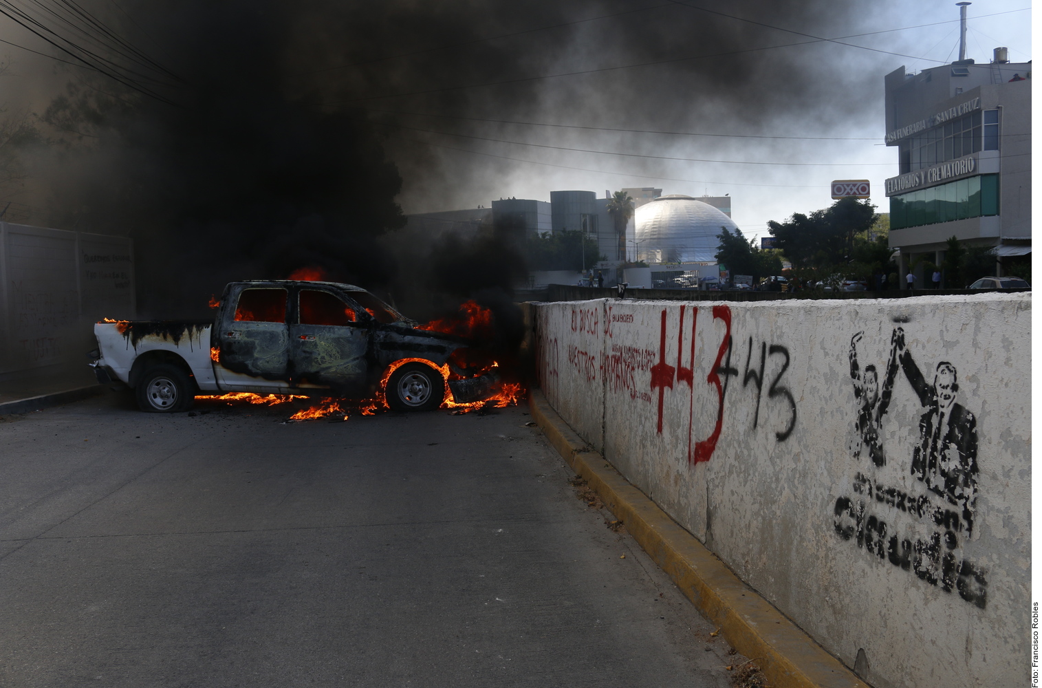 Una camioneta del Gobierno estatal que estaba atravesada en uno de los accesos a la Fiscalía también fue quemada por los estudiantes.
