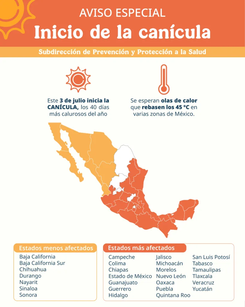 En cuanto a las recomendaciones para sobrellevar la canícula 2025 son hidratación adecuada, evitar asolearte entre las 12 y las 4 de la tarde y usar ropa ligera y protector solar.