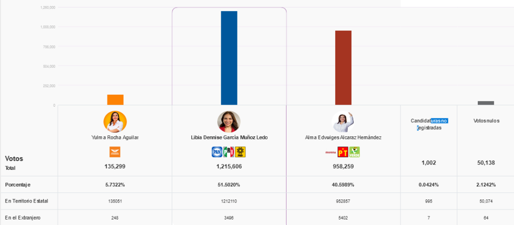 Libia Dennise lleva la delantera al acumular 1 millón 215 mil 606 votos para ocupar la gubernatura.