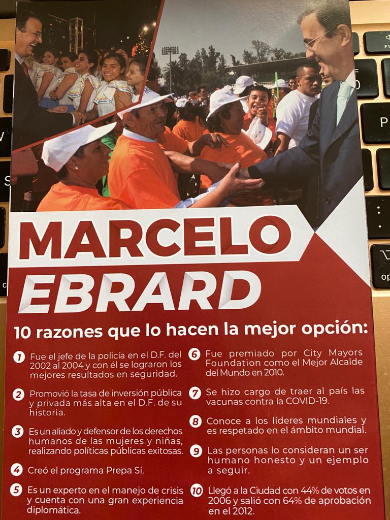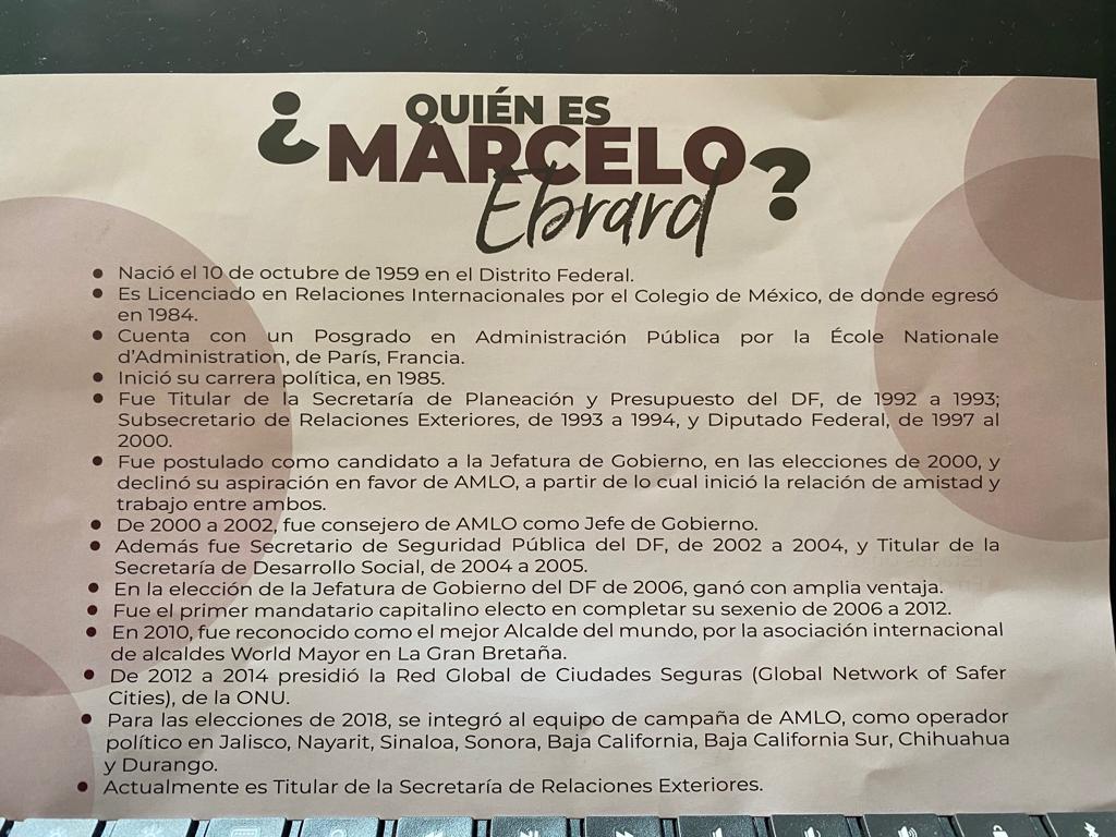 En el caso del Secretario de Relaciones Exteriores (SER) Marcelo Ebrard Casaubón, se repartieron volantes con información de su trayectoria política, biográfica y que hace referencia a por qué es la “mejor opción”. Se compartieron en los cruceros de las avenidas de León y dentro de un periódico impreso que hace referencia al 4º Informe de la senadora Martha Lucía Micher Camarena.