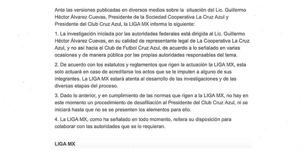 A través de un comunicado, la Liga MX se dijo enterada de la situación del mandamás cementero, al tiempo en que destacó su figura de presidente y no propietario, por lo que según los estatutos de la Federación Mexicana de Futbol y de la Liga MX, el equipo no ha cometido ninguna falta que merezca sanción