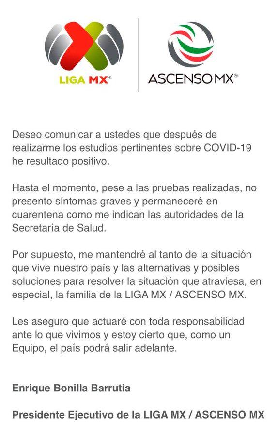 En el comunicado, la Liga MX detalla que Bonilla ya se encuentra aislado y tomando las debidas precauciones y medidas después de dar positivo en Coronavirus.
