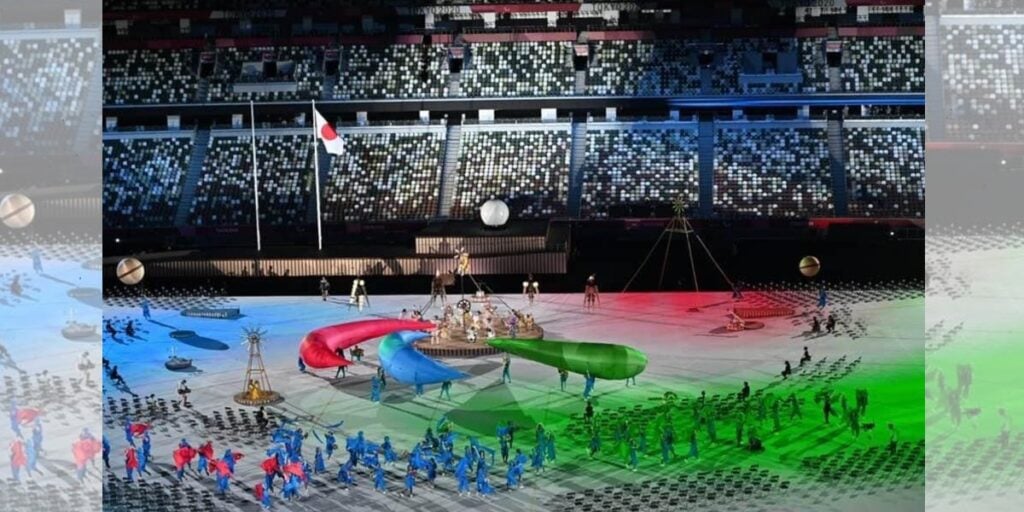 Sin público en el estadio por las estrictas medidas de seguridad para hacer frente a la pandemia de COVID-19, los pocos asistentes a la ceremonia pudieron disfrutar de una historia desarrollada en un aeropuerto y con las alas de los aviones como protagonistas, como metáfora del impulso que mueve a los deportistas con discapacidad a cosechar éxitos extraordinarios en sus vidas.