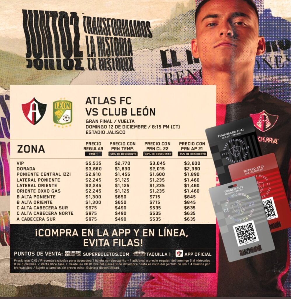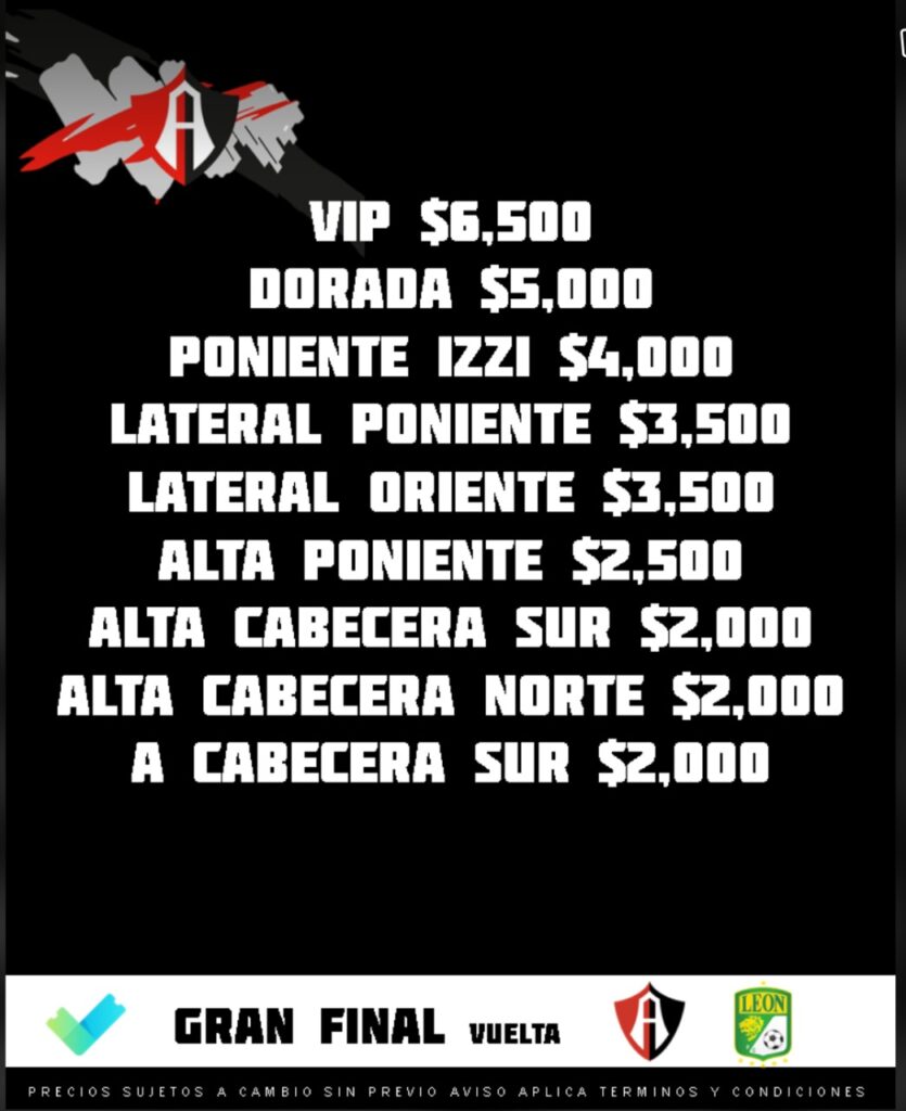 De acuerdo a la zona, el Club Atlas ofertó con costos oficiales que llegan hasta los 5 mil 535 pesos. El más barato es de 975 pesos en la cabecera de la zona sur del estadio Jalisco.
