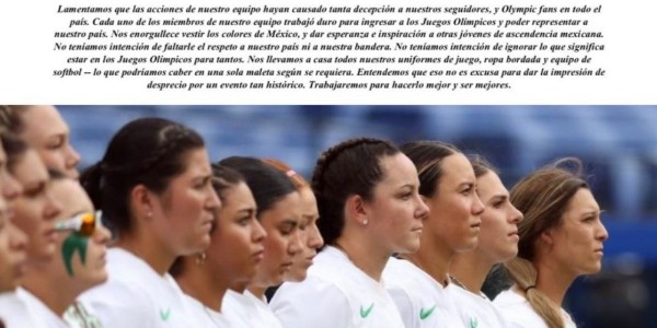 “Lamentamos que las acciones de nuestro equipo hayan causado tanta decepción a nuestros seguidores, y Olympic fans en todo el país. Cada uno de los miembros de nuestro equipo trabajó duro para ingresar a los Juegos Olímpicos y poder representar a nuestro país. Nos enorgullece vestir los colores de México, y dar esperanza e inspiración a otras jóvenes de ascendencia mexicana”.