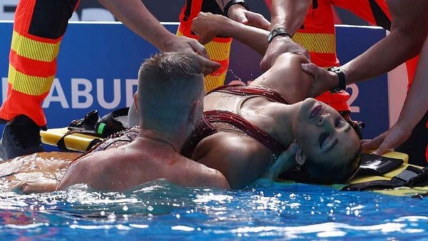 La nadadora de 25 años fue rescatada por su entrenadora, la española Andrea Fuentes, que se tiró al agua vestida con pantalón corto y camiseta, para lograr sacarla a la superficie con sus brazos.