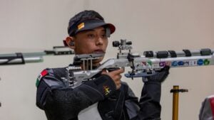 Tiro en la prueba de Rifle de Aire 10 metros de los Juegos Panamericanos Santiago 2023, luego de que en su último disparo le dio a México la segunda medalla de oro y, de paso, boleto olímpico para París 2024.