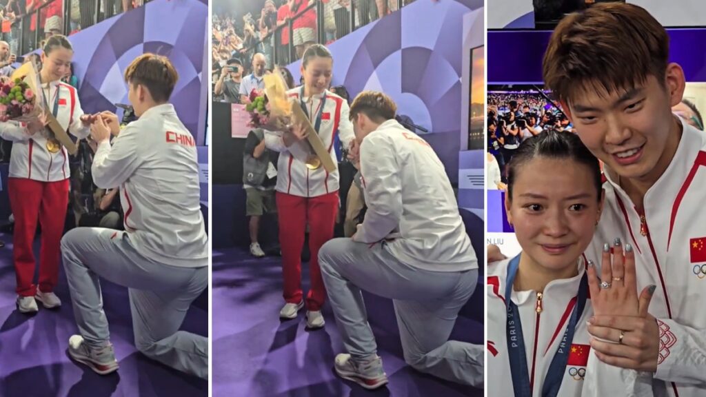 Durante la celebración del oro de la ganadora olímpica Huang Ya Qing, las cámaras capturaron el instante en que Liu Yuchen, con gran sorpresa para todos, se arrodilló y sacó una caja con un anillo de compromiso.