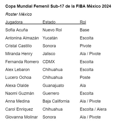 Dirigido por el coach Efraín Acuña, el cuadro mexicano presentó su roster para el evento integrado por 12 jugadoras, entre las que destaca la guanajuatense Alexa Olalde, quien desempeña la posición de ala, mismas que buscarán romper la hegemonía de los Estados Unidos, que ha ganado cinco de seis ediciones de la justa.