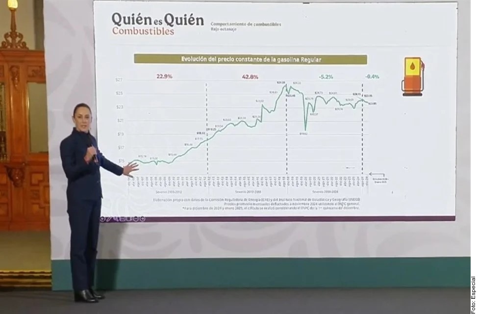 Durante la mañanera de Sheinbaum, el funcionario señaló que el precio de la gasolina regular en México mostró un crecimiento acumulado significativo de 22.9 por ciento de 2006 a 2012, con Calderón, y de 42.8 por ciento entre 2012 y 2018, en la Administración de Peña Nieto.