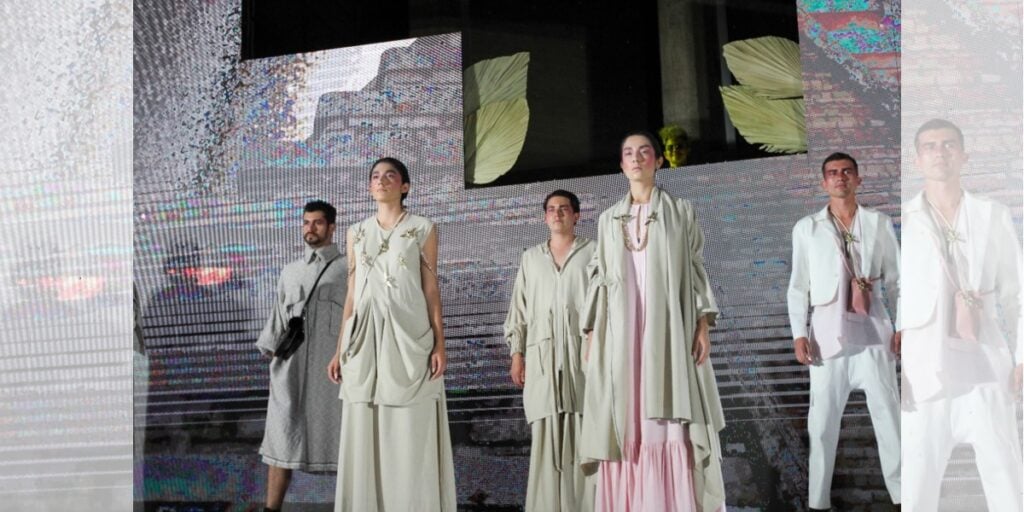 Linos que cuelgan lánguidamente de la cabeza de los modelos, cárdigans larguísimos de punto beige con aberturas a los lados acomodados a la usanza del rebozo, inesperados paneles fruncidos en la espalda que sorprendieron a los asistentes, cortes amplios, pantalones amplios y cortos, guiños a medio oriente y una paleta de color que recuerda también a las playas: arena, marrón, verde olivo, gris mármol y un poco de rosa y blanco.