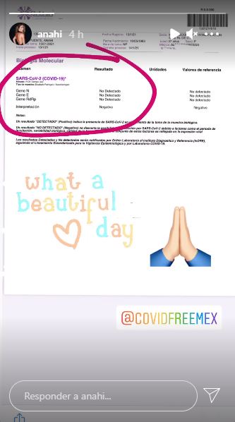Así, luego de pasar su respectivo periodo de cuarentena, Anahí compartió una imagen de una prueba de coronavirus, donde se revela que ya no tiene rastros de la enfermedad.