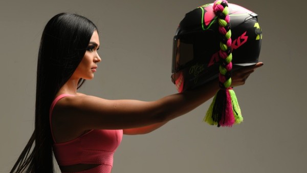 “Me caracterizan las colitas del casco. Me gusta ser muy femenina, mi moto es rosada, mis colitas en el casco han sido un boom. Estando aquí fue que surgió mi línea de cascos en Brasil y ha sido un éxito”, explicó.