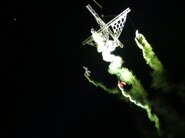El público presente en Los Pastitos, en el Festival Internacional Cervantino 50, disfrutó de la puesta en escena del Carillon, el Vuelo del Tiempo, de los acróbatas de Kitonb.