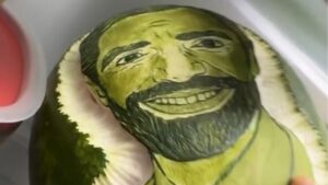 Chequen esto, ahí está tallada mi cara en una sandía, pero vean el trabajo, el detalle, es una obra de arte; o sea, sí la talló en una sandía”, dijo en un video compartido a través de Instagram.