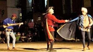 juglaría medieval, combinando teatro, música, pantomima y esgrima.