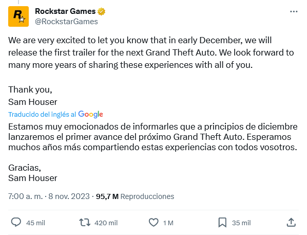 “Estamos muy emocionados de informarles que a principios de diciembre lanzaremos el primer avance del próximo Grand Theft Auto. Esperamos muchos años más compartiendo estas experiencias con todos ustedes”, añadió Rockstar.