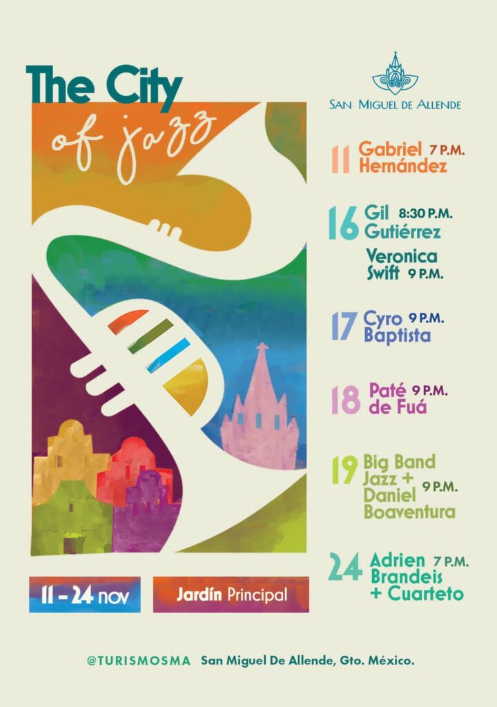 «Durante el 11 al 24 vamos a tener la segunda edición del jazz; son en el Jardín Principal, no tiene ningún costo, es para inculcarles a la gente todo el tema de la música, del arte, de la calidad, de eventos que podemos tener aquí en San Miguel de Allende y es darles una oferta más que puedan venir a San Miguel a disfrutar de algo diferente», señaló