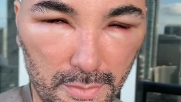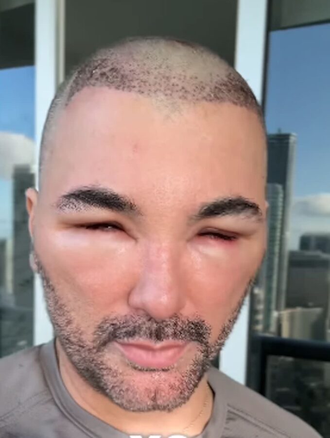 En las imágenes y videos publicados, Mejía muestra su rostro visiblemente inflamado e hinchado luego del implante capilar que le practicaron.
