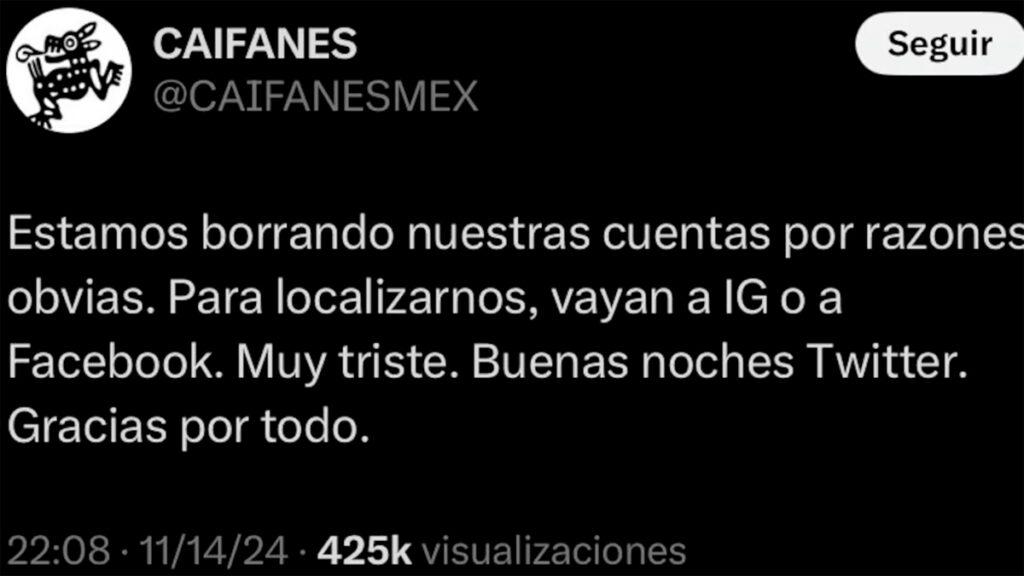 "Estamos borrando nuestras cuentas por razones obvias, para localizarnos, vayan a Instagram o a Facebook, muy triste, buenas noches, Twitter, gracias por todo".Te puede interesar: ¡Se les adelantaron! Caifanes ventila concierto en la Feria de León 2025