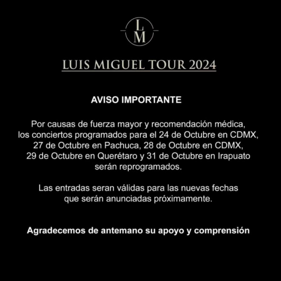 Luego de una serie de cancelaciones inesperadas anunciadas el pasado 24 de octubre, el equipo del intérprete informó que la decisión de posponer los conciertos se debió a recomendaciones médicas, aunque sin entrar en detalles.