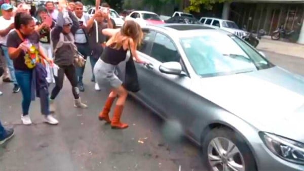 A la salida, el ambiente se tornó tenso. Un grupo de personas la esperaba en las inmediaciones del Poder Judicial, y tras verla, comenzaron a gritarle insultos y frases como “¡Racista, vete a tu país!” y “¡Negros, como nos gritabas!”. Algunos manifestantes incluso le arrojaron agua, refresco, botellas vacías y golpearon el automóvil Mercedes Benz en el que intentaba huir. Bañaron el parabrisas con refresco para obstruir la visibilidad del chofer.