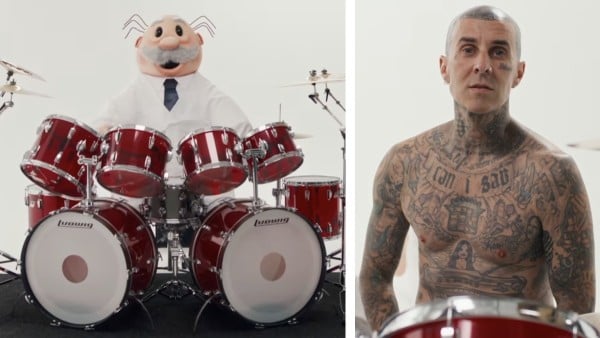 La popular botarga del Dr. Simi aparece en una grabación tocando la batería, mientras que en otra escena se observa a Travis Barker junto al personaje en un auto convertible.
