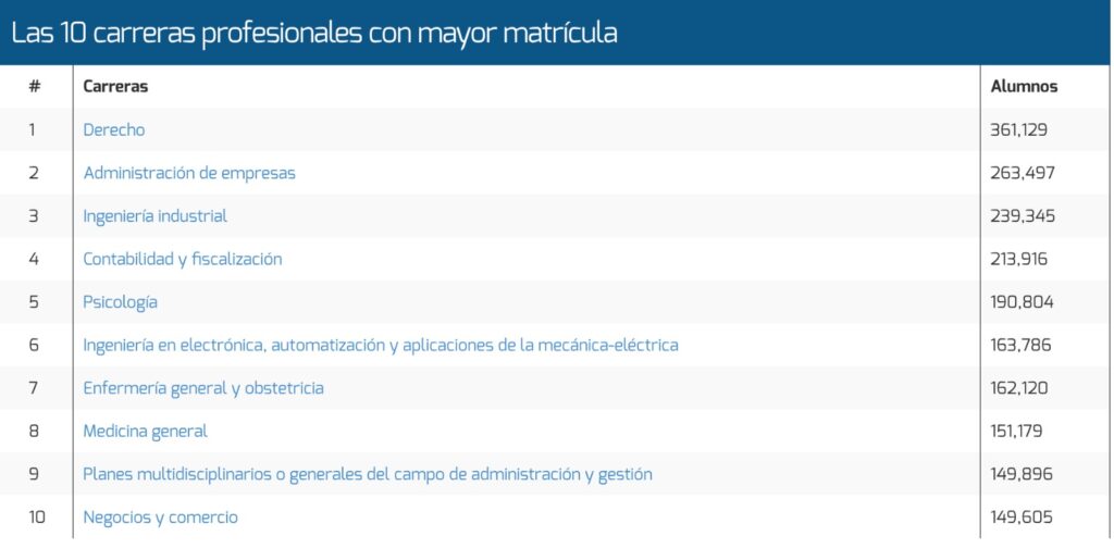Las carreras que más estudian los jóvenes en el país son: Derecho, Administración de empresas, Contabilidad y fiscalización, Psicología, Formación docente para primaria, Ingeniería Industrial, Desarrollo de Software, Enfermería general y obstetricia, ciencias de la educación e ingeniería electrónica.