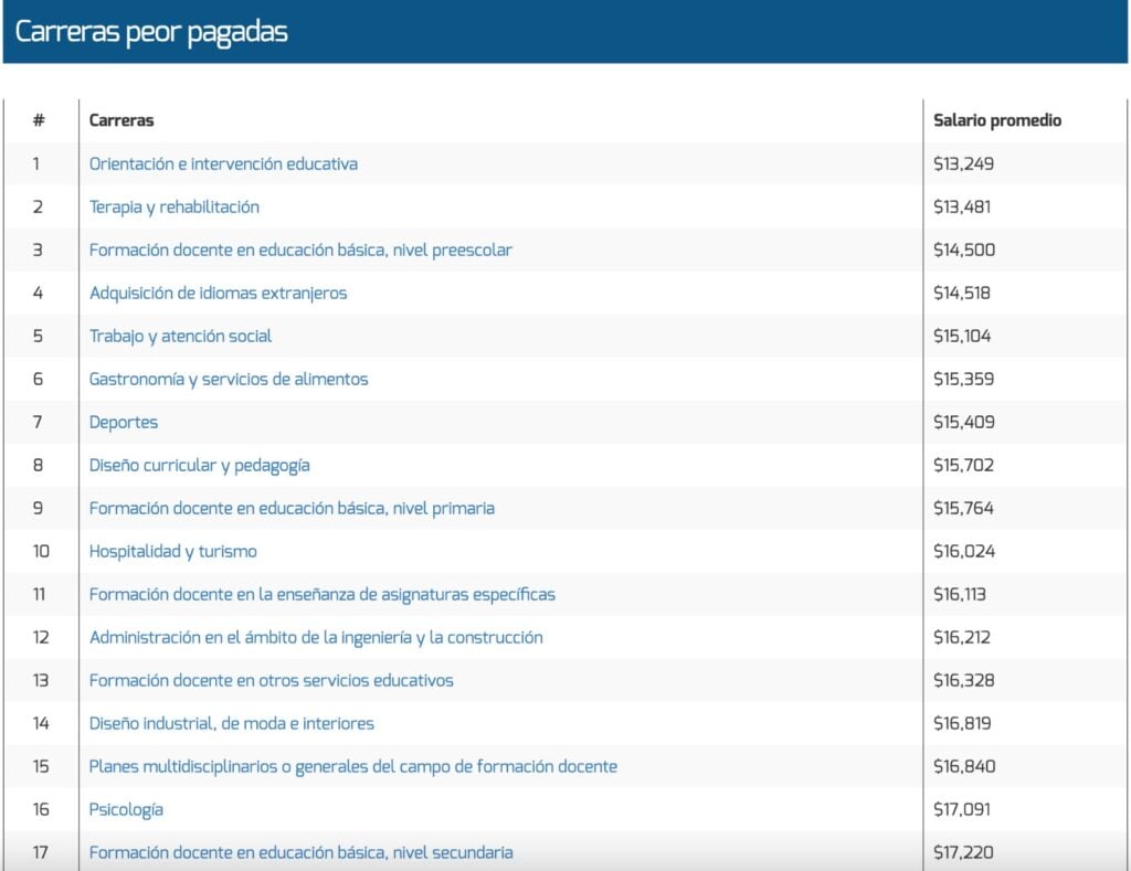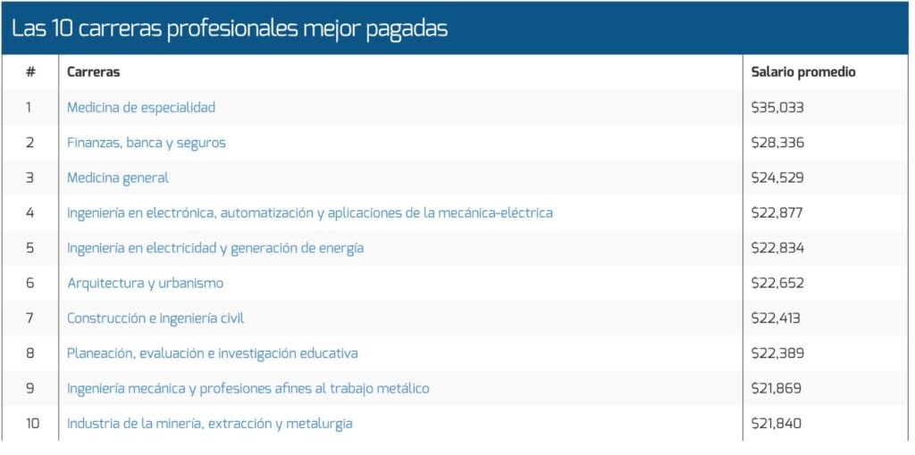 Pero, entre las 10 con mejores percepciones son además de medicina especializada con un sueldo promedio de 35 mil pesos; finanzas y banca con 28 mi 336 pesos, medicina general con 24 mil 529; la ingeniería en electrónica, automatización y aplicaciones de la mecánica eléctrica con 22 mil 877; están arquitectura y urbanismo, con salario promedio de 22 mil 625, o construcción e ingeniería civil, que oscila en los 22 mil 413 pesos; en el caso de las carreras relacionadas con la planeación, evaluación e investigación educativa, es de 22 mil 389 pesos.