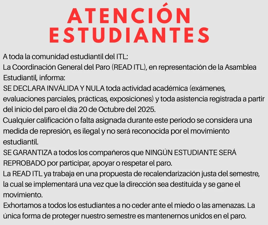 “Exhortamos a todos los estudiantes a no ceder ante el miedo o las amenazas. La única forma de proteger nuestro semestre es mantenernos unidos en el paro”, comunicaron a la comunidad desde la Coordinación General del Paro (READ ITL).