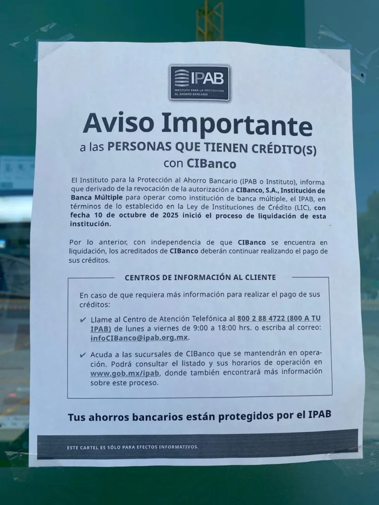 La Comisión Nacional Bancaria y de Valores, público el pasado 13 de octubre en el Diario Oficial de la Federación, el oficio de revocación de autorización para operar como institución de Banca Múltiple CIBanco S A de C V. Esto tras la acusación del gobierno de los Estados Unidos por presunto lavado de dinero.El IPAN comenzó con el pago de los depósitos asegurados desde el lunes 13 de octubre, para lo que es necesario ingresar al portal www.gob.mx/ipab