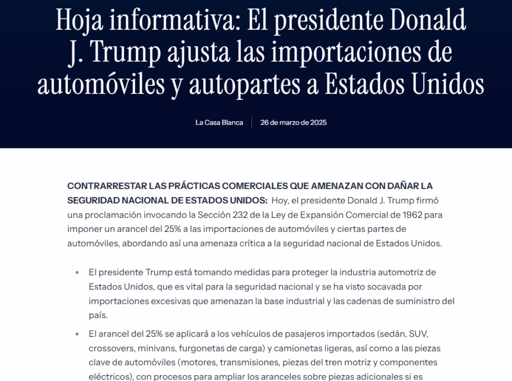 "Lo que vamos a implementar es un arancel del 25% para todos los autos que no se fabriquen en Estados Unidos, si se fabrican en ese país. No hay arancel alguno. Empezamos con una base del 2.5%, que era la que teníamos, y llegamos al 25%".