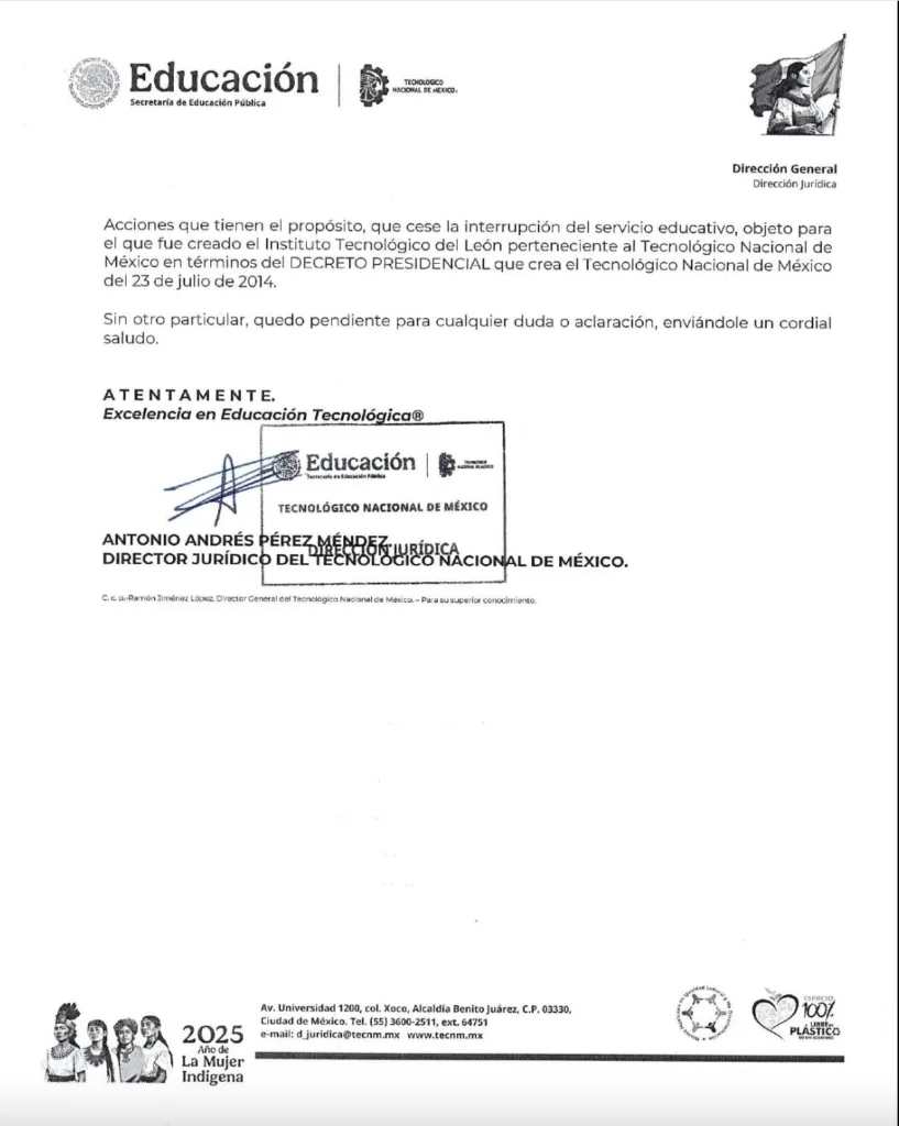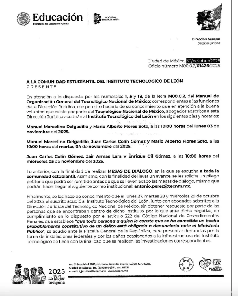El objetivo —explicó la Dirección Jurídica en el comunicado— de las denuncias ante la FGR es concluir con la interrupción del servicio educativo, objeto para el que fue creado el Instituto Tecnológico de León, perteneciente al Tecnológico Nacional de México.