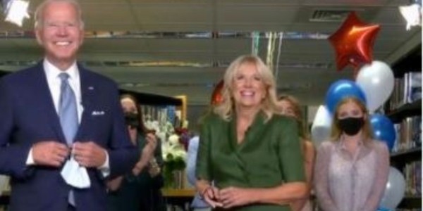 Una vez terminado el conteo de los estados, la cámara pasó a enfocar al candidato. Rodeado por su familia y globos color azul, blanco y rojo, Biden aceptó la candidatura con un breve mensaje.