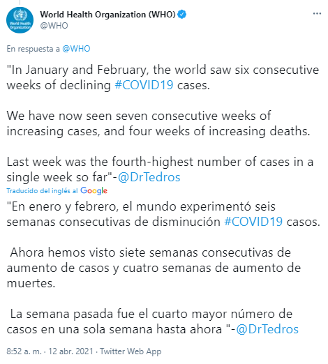 La semana pasada fue la cuarta con más contagios que se ha registrado desde que comenzó la pandemia con 4.4 millones de casos reportados a nivel mundial, y es la séptima semana consecutiva con aumento de casos confirmados y la cuarta con aumento de muertes, por lo que el director de la OMS, Tedros Adhanom Ghebreyesus, llamó a mantener las medidas sanitarias y los confinamientos, de ser necesarios.