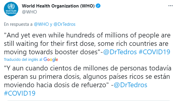 Luego de que Israel y Alemania anunciaran que pretenden aplicar una tercera dosis de las vacunas contra el COVID-19 como refuerzo para su población de la tercera edad, el presidente de la Organización Mundial de la Salud (OMS), Tedros Adhanom Ghebreyesus, llamó a estos países a esperar y fomentar el uso de vacunas en los países de menos recursos.