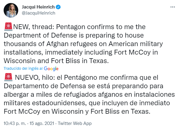 De hecho, el Departamento de Defensa dijo que traerá por lo menos a 30 mil solicitantes de visa especial de Afganistán a los Estados Unidos, mismos que serían albergados en instalaciones en Fort Bliss, en Texas, y Fort McCoy, en Wisconsin.