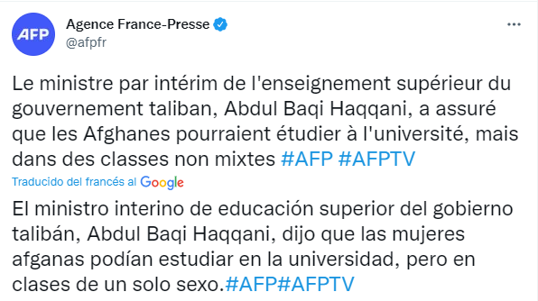 El pueblo de Afganistán seguirá teniendo educación superior según las reglas de la sharia (ley islámica) que veda las clases mixtas", señaló.
