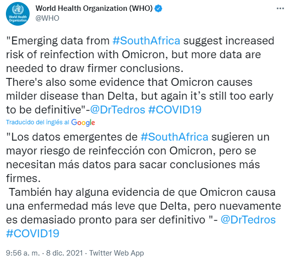 "Los datos preliminares de Sudáfrica sugieren un mayor riesgo de reinfección con Ómicron, pero se necesitan más datos para sacar conclusiones más firmes. También hay alguna evidencia de que Omicron causa una enfermedad más leve que Delta, pero nuevamente es demasiado pronto para ser definitivo”, comentó Tedros.