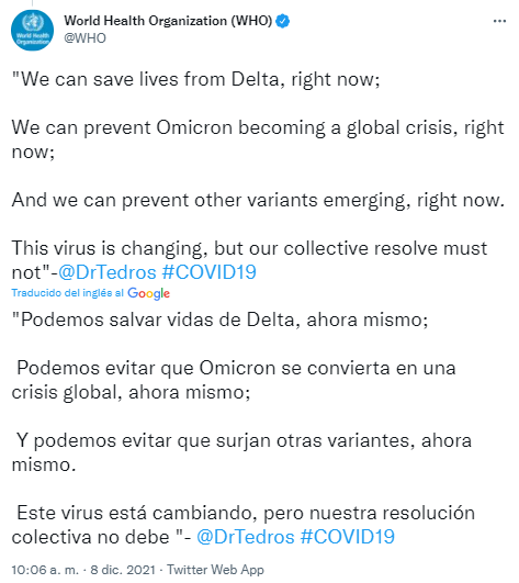 Por esto, el doctor Tedros llamó a la comunidad internacional a acelerar las vacunaciones para personas vulnerables, a intensificar las políticas públicas para reducir la transmisión del virus, aumentar la vigilancia y el número de pruebas y secuenciaciones del virus realizadas para compartir los resultados con la comunidad científica, y así poder hacer un frente común en contra de la pandemia.