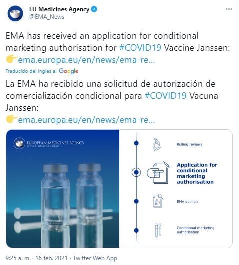 Por ahora, la EMA analizará los resultados de los estudios del medicamento de Janssen lo más pronto posible, e inclusive informó que desde diciembre ya había comenzado a evaluar las pruebas del fármaco, aunque por muy pronto, esperan autorizarlo a mediados de marzo.