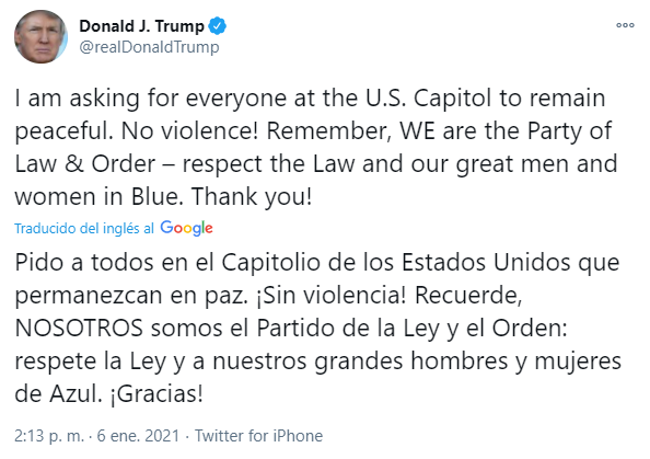 Poco después Trump también llamó a sus seguidores a dejar las protestas e ir a casa en un mensaje en video.