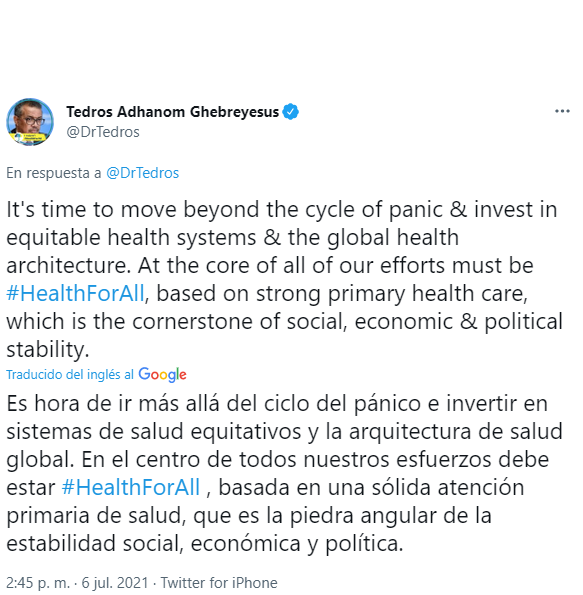 "Los países que están abriendo sus empresas son los que han controlado ampliamente el abastecimiento de material de emergencia, como los equipos de protección personal, los test, el oxígeno y, especialmente, las vacunas", recalcó Tedros.