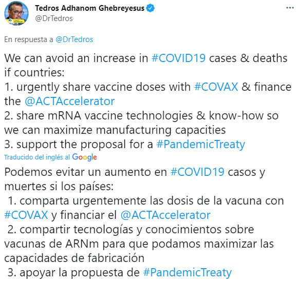 "Durante este tiempo, los países que no tienen acceso suficiente a esos productos tienen que enfrentar oleadas de hospitalizaciones y muertos. Algo que todavía se ha agravado más por las variantes del virus", añadió.