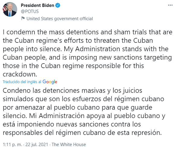 "Estados Unidos apoya a los valientes cubanos que han salido a las calles para oponerse a 62 años de represión bajo un régimen comunista", afirmó el presidente.