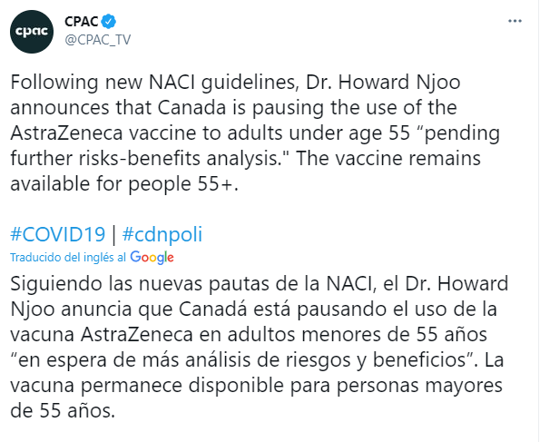Following new NACI guidelines, Dr. Howard Njoo announces that Canada is pausing the use of the AstraZeneca vaccine to adults under age 55 “pending further risks-benefits analysis." The vaccine remains available for people 55+.#COVID19 | #cdnpoli pic.twitter.com/x5P2jFeZzx