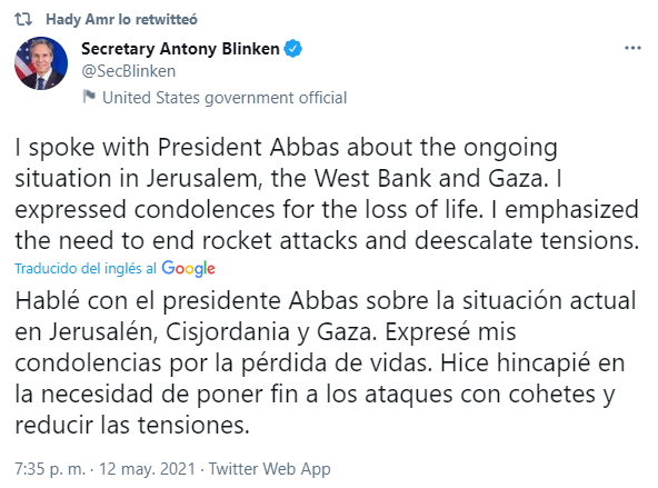 Tras esto, el secretario de Estado de los Estados Unidos, Anthony Blinken, anunció el envío del subsecretario adjunto de Estado, Hady Amr, a la región de inmediato para "reforzar la necesidad de trabajar hacia una calma sostenible", decía el comunicado.